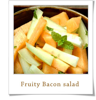 Combine the muskmelon, cucumber and bacon in a salad bowl. Season with olive oil, salt and pepper.